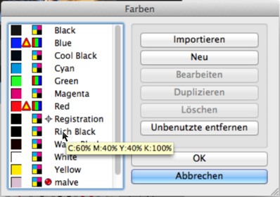 werden objekte aus anderen dateien (und von anderen programmen) importiert, sind auch deren farben verfügbar. unter umständen entstehen so mehrere identische farben (oder solche, die nur durch unmerklich voneinander abweichen. bei grösseren projekten kann die liste rasch unübersichtlich werden.