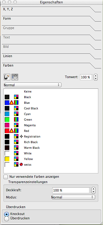 über das eigenschaften-fenster sind die definierten farben auswählbar.