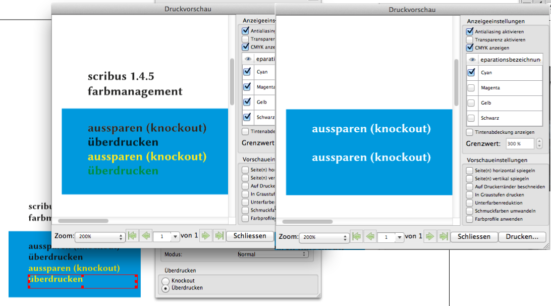 druckvorschau: links alle farben, rechts nur der cyan-auszug – die ‚sattere‘ farbe beim überdrucken ist auch bei der schwarzen schrift sichtbar.