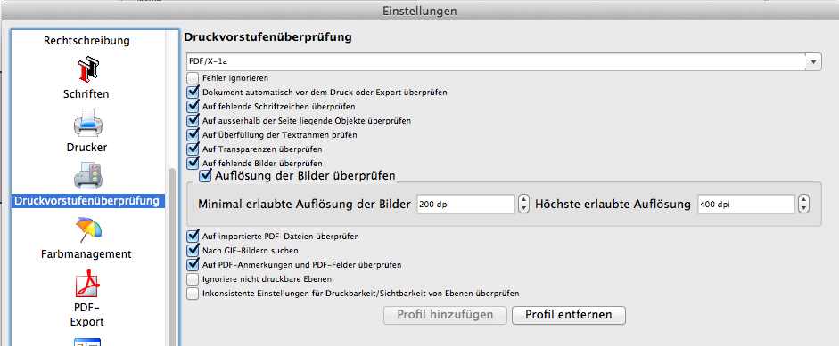 die .pdf/x-formate erscheinen nur bei aktiviertem farbmanagement. diese basieren auf .pdf 1.3 – sie unterstützen also keine transparenz!
