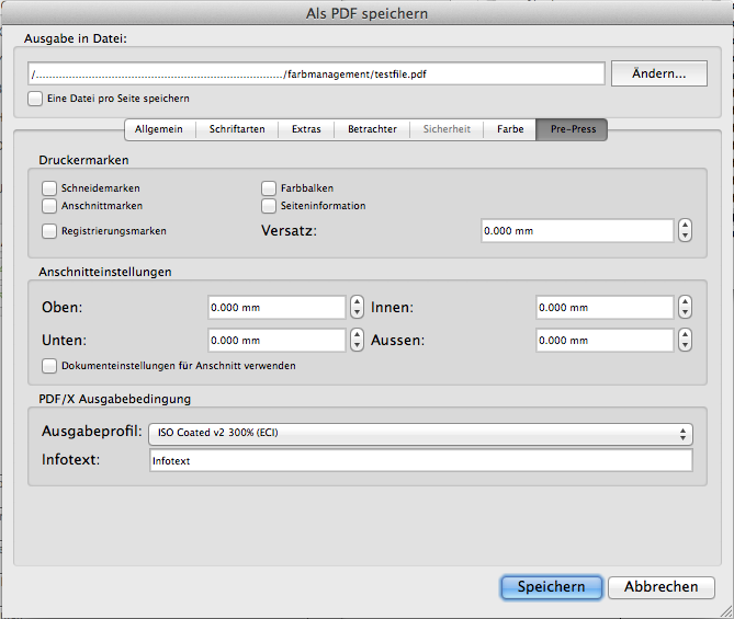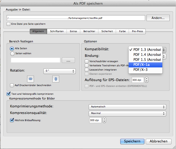 danach erscheint der .pdf-export-dialog. hier interessieren uns im zusammenhang mit farbe die reiter ‚allgemein‘, ‚farbe‘ und ‚pre-press‘.