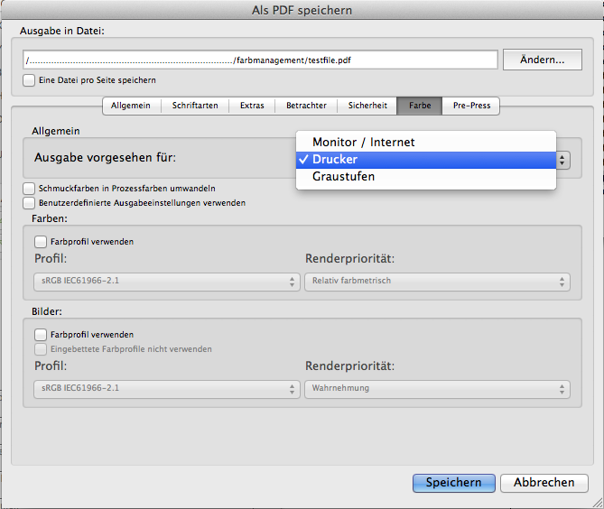 im reiter ‚farbe‘ sollte unter ‚ausgabe vorsehen für:‘ auch dann ‚monitor / internet‘ ausgewählt werden, wenn das file für den ausdruck auf einem standard laser- oder tintenstrahldrucker dienen soll. ‚drucker‘ steht hier für: