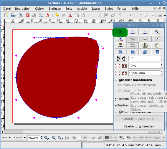 in meine vergangenheit habe ich viel mit den knoten in scribus "gekämpft" und mitlerweile vermeide ich (fast) jede bearbeitung der knoten mit der maus.