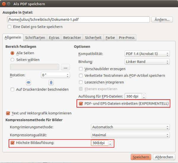 Die PDF-Datei für die 4 Seiten ist 80 MB groß. Das liegt sicher an den Bildern darin und verspricht einen hochwertigen Druck, aber gibt es denn keine Möglichkeit, auch mal eine deutlich(!) kleinere Datei zu erzeugen, bei der die Bilder von mir aus sehr grob drin stecken? Ich erinnere mich an so eine Möglichkeit bei Inkscape. Zweck der Sache wäre, anderen das Layout und den Text zu übermitteln, wobei die Qualität der Bilder da egal wären.