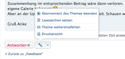 Wenn du kein Antwort schreibst, dich das Thema aber interessiert, machst du neben dem Antwort-Button den Schraubenschlüssen auf und wählst "Lesezeichen setzen". Wenn hier etwas mehr steht, wirst du das schon erkennen. Ob du dann per Mail benachrichtigt wirst, kannst du in deinen Persönlichen Einstellungen festlegen. Die findest du oben Rechts, in dem Dropdown-Feld, wo du dich auch ausloggen kannst.