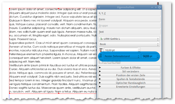 Bei meinem Beispiel mit der Schriftart URW Gothic in der Schriftgröße 10 empfand ich eine Zeilenhöhe von 14 pt als angenehm lesbar.