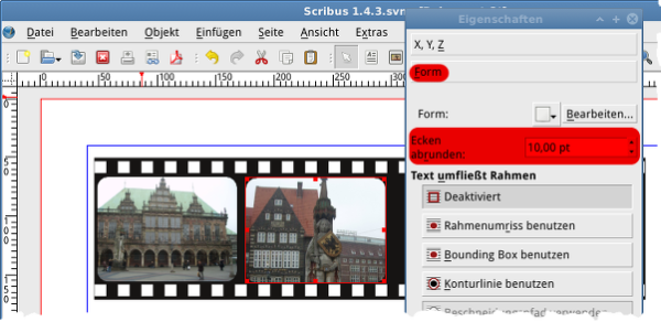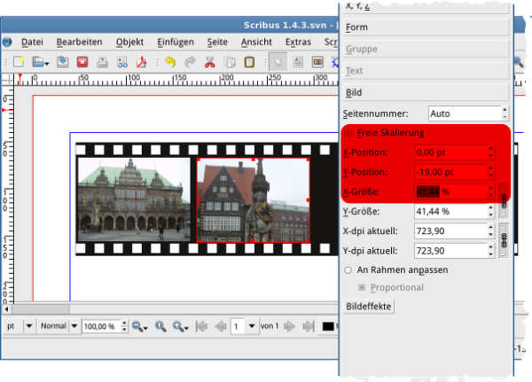 Ja nu, das sollte eigentlich keine wissenschaftliche Arbeit werden. Ich wusste nicht einmal, wie groß so ein Film in Natura ist. In Gimp gibt es da ein eingebautes Script bei den Rahmen, ich dachte das krieg ich bestimmt auch in Scribus hin