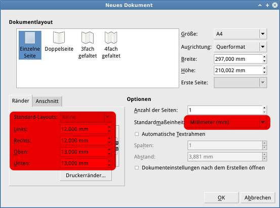 Starte nun ein neues Projekt in Scribus Datei - Neu und richte deine Seite ein:
