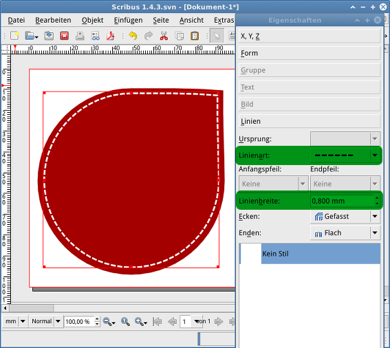 Wechsele in das Register Linie. Ändere die Linienform in Striche. Stelle die Linienbreite auf ca. 0,8 mm ein.