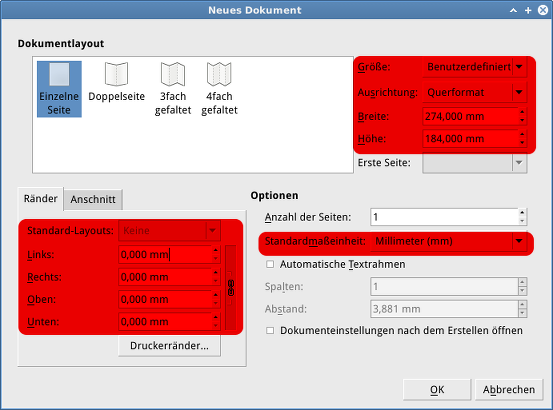 Starte nun ein neues Projekt in Scribus Datei - Neu und richte deine Seite ein: