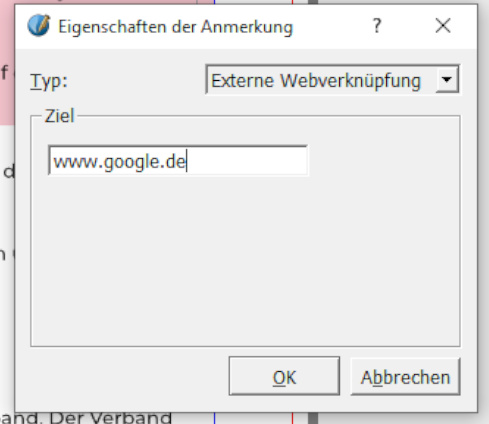 - Wiederum über Kontextmenue "PDF-Optionen/Eigenschaften der Anmerkung" den Feldtyp als "Externe Webverknüpfung" definieren