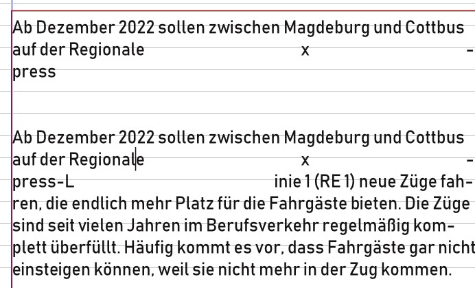 Ich habe ein Problem mit einem linksbündigen Text (Beispiel unten). Füge ich eine Textdatei mit "CTRL+I" ein, werden die 2. und 3. Zeile ohne erkennbaren Grund auseinandergerissen, obwohl dort kein Zeilenwechsel o. ä. vorkommt. Schreibe ich den Text im Textrahmen nochmal neu (1. - 3. Zeile), passiert das gleiche Phänomen. Der Text wird während des Schreibens auseinandergerissen. Leerräume zwischen den Wörtern löschen und neu einfügen bringt auch nix.