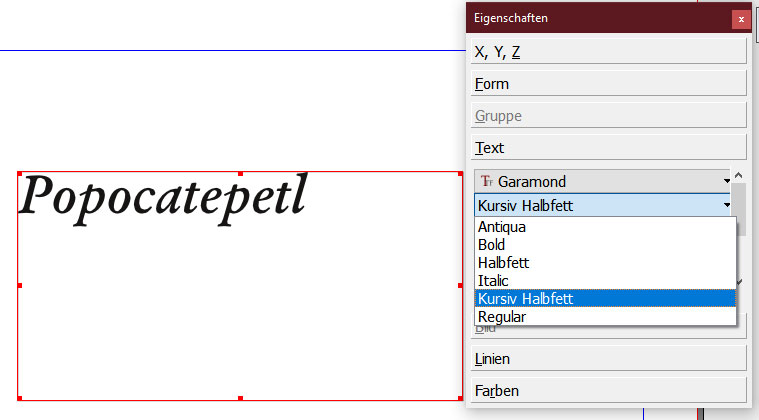 - Als Schrift verwende ich Garamond. Ich weiß inzwischen, wie ich Textteile fett oder kursiv mache. Ich finde aber nicht, wie ich den Text fett UND kursiv hinbekomme.