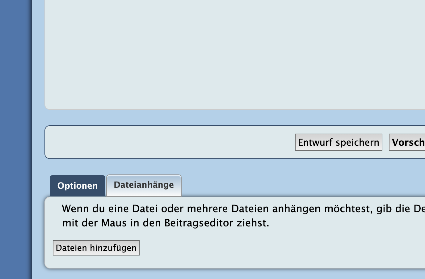 du kannst eine datei aber auch einfach aus deinem file browser ('explorer' bei windows, 'finder' bei macos…) in den beitragseditor ziehen, dann erscheint er auch unter 'dateianhänge'. so habe ich es hier gemacht: