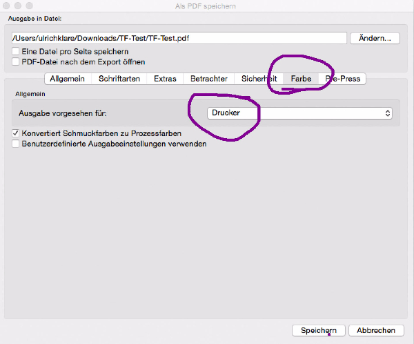 Ich habe tatsächlich im PDF-Dialog "Monitor/Internet" für die Druckausgabe verwendet, weil mir die Sättigung in den Grafiken (den Farben allgemein) kräftiger erschien.