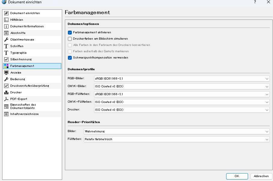 In den Dokumenteinstellungen habe ich Farbverwaltung aktiviert und dort für Cmyk das entsprechende Profil " ISO Coated v2 (ECI)" ausgewählt. Aber wenn ich dann auf Exportieren gehe und PDF X4 oder X1-a auswähle, ist dort beim Reiter "Farben" unter den Farbprofilen leider kein ISO Coated v2 (ECI) auszuwählen.