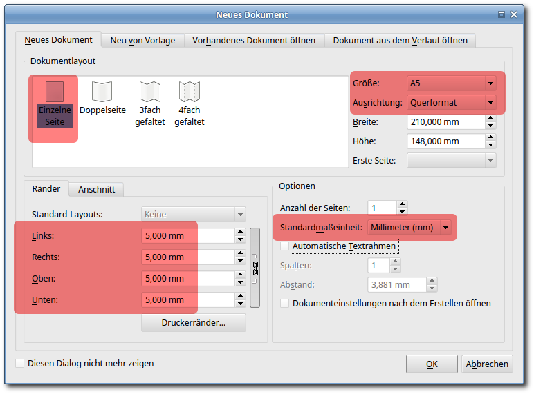 Starte Scribus mit einem Dokument A5 im Querformat. Den Rand habe ich auf 5 mm eingestellt.
