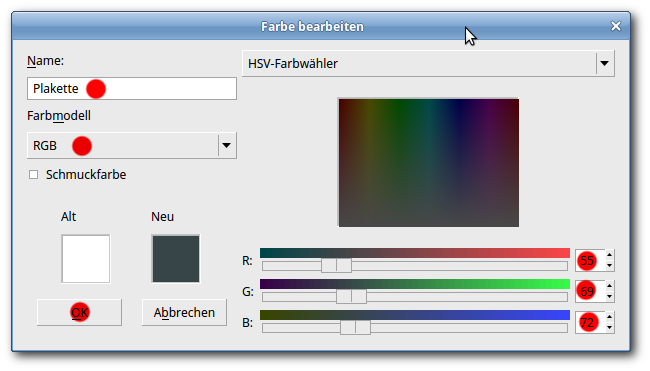 Wechsele in das Register Farben. Wähle als Linienfarbe "Plaketten-Text".