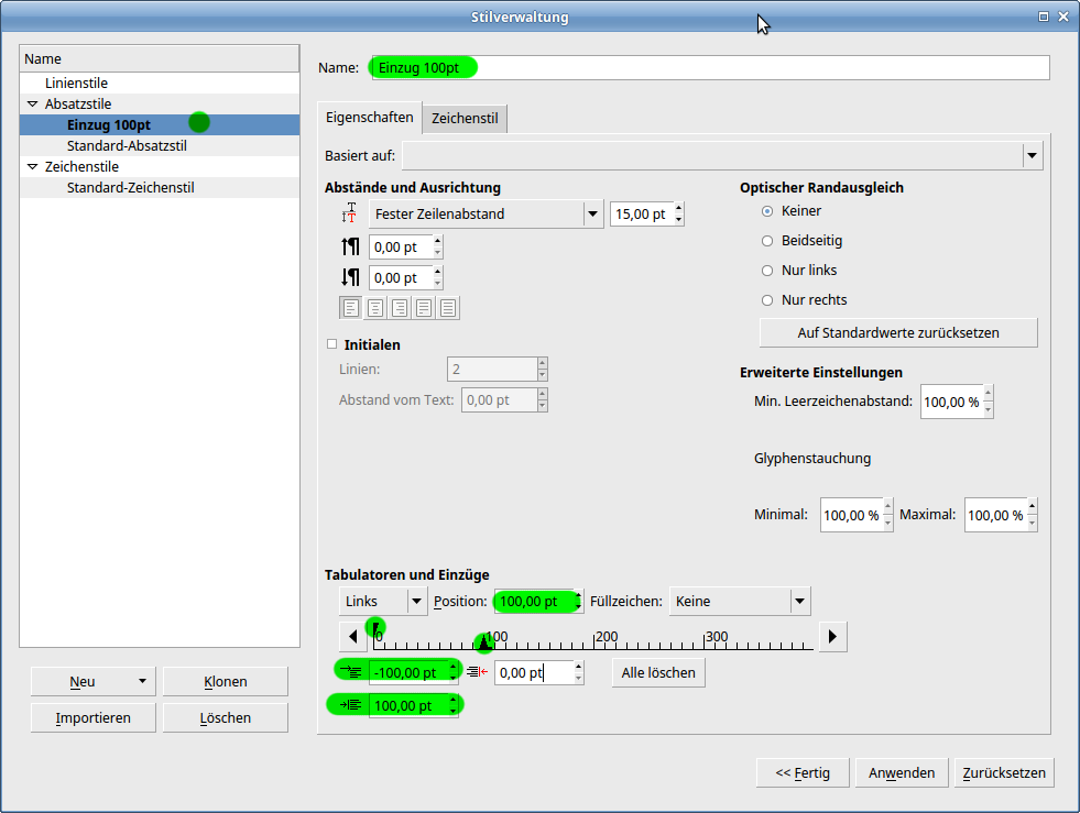 Dann brauchst du noch einen linksbündigen Tabulator. Setze ihn auf die gleiche Position, sodass der Einzug und der Tabulator gleich groß sind. Du musst dazu erst in das Lineal klicken, dann kannst du die Zahl im Feld ändern.