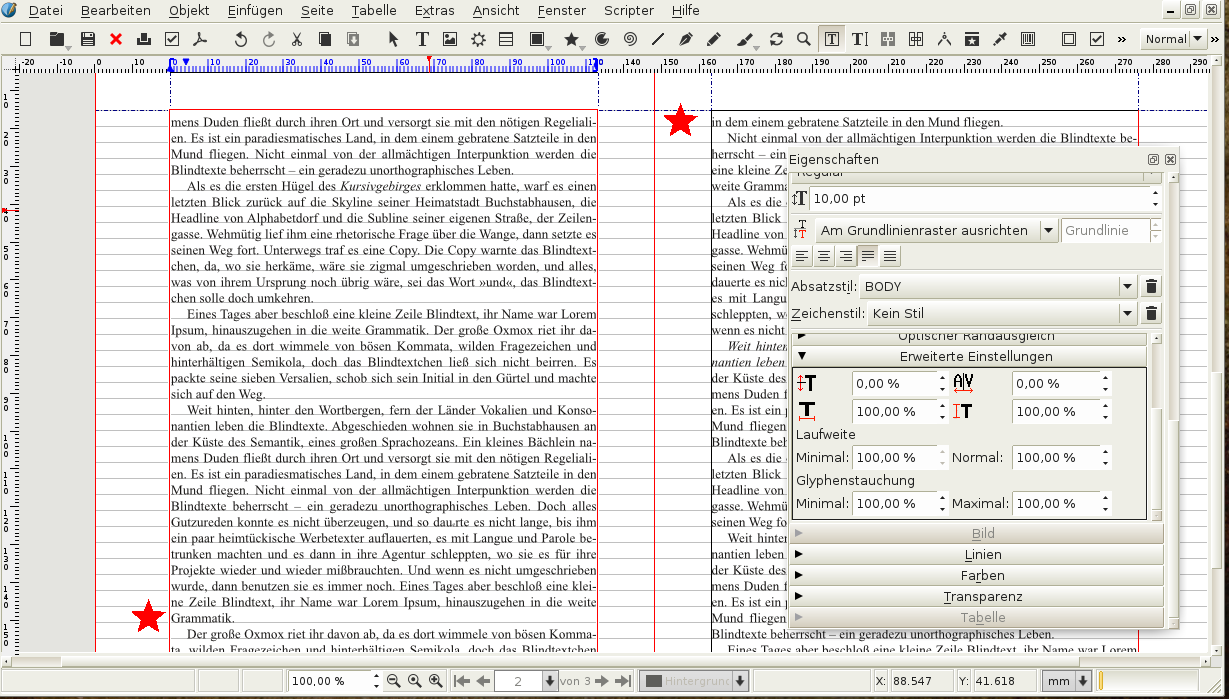 Zusätzlich bietet sich im DTP auch eine Möglichkeit an, die der Bleisetzer nicht hatte: Man kann die Schriftbreite um ein bis zwei Prozent verändern, das fällt nicht auf. Auch dadurch lässt sich häufig eine Zeile ein- oder ausbringen. Um die Schriftbreite für den ganzen Absatz flexibel anzupassen, bietet Scribus die Funktion "Glyphenstauchung". Natürlich kann man auch Kombinationen von "Laufweite" und "Glyphenstauchung" verwenden. Man muss nur darauf achten, dass solche Eingriffe unauffällig sind: Die Schriftbreite sollte nicht so verändert werden, dass man es merkt, die Wortzwischenräume dürfen klein sein, aber nicht so klein, dass kein Abstand mehr erkennbar ist, und nicht so groß, dass Löcher entstehen, über die das Auge stolpert. Manchmal gibt es schwierige Fälle, wo man experimentieren muss.