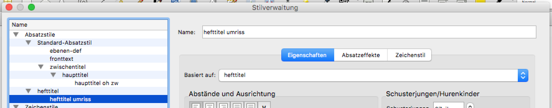 der umgang mit absatz- und zeichenstilen ist nicht bestandteil dieses tutorials. ich empfehle aber trotzdem, unter ‚bearbeiten‘ → ‚stile‘ (f3) einen standard-absatzstil für den fliesstext und darauf aufbauende stile für die weiteren textobjekte zu definieren.