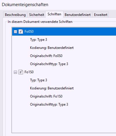 In den Dokumenteneigenschaften sind zwei Schriftarten gelistet, allerdings mit kryptischen Titeln: