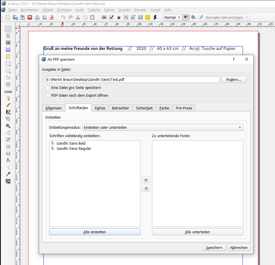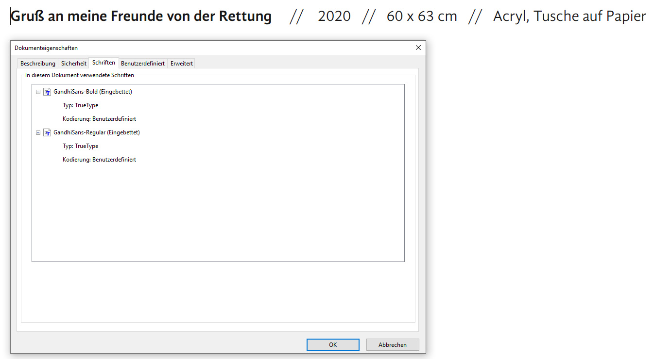 Du schreibst ja im ersten Beitrag selbst, dass du beim Exportieren des PDFs die Gandhi nicht so richtig wunschgemäß einbetten konntest. Auf der anderen Seite, wenn du die Schrift stattdessen in Kurven umgewandelt hättest, würde das PDF unter Schriften keine engebetteten Ersatzschriften anzeigen, vermute ich.