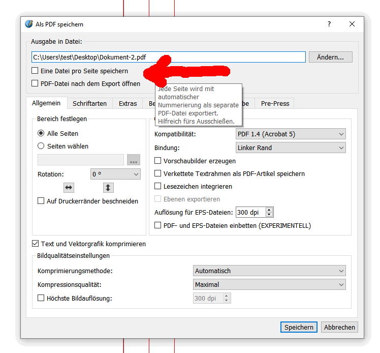Wie kommst du darauf? Bei mir klappt das: Ohne den Haken gibt es immer noch mehrere Seiten, aber in einem PDF: (Richtig, den Haken braucht man dazu gar nicht, wenn die Seiten in einem Gesamt-PDF sein dürfen.)Scribus90210 hat geschrieben: Mo 10. Mai 2021, 23:15 Es teilt aber die Doppelseiten nicht in zwei einzelne Dateien.