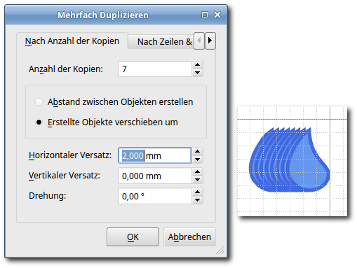 Dupliziere den Wassertropfen mehrfach ca. 7-mal. Objekt - Mehrfach duplizieren. Um die einzelnen Tropfen sehen zu können, ist es sinnvoll, sie um 1 mm verschoben voneinander anordnen zu lassen.