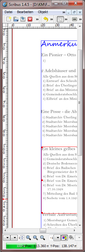 für das Buchprojekt meines Vereins habe ich inzwischen einige kleine Kapitel mit Scribus 1.4.5 gesetzt - es läuft eigentlich ganz gut.