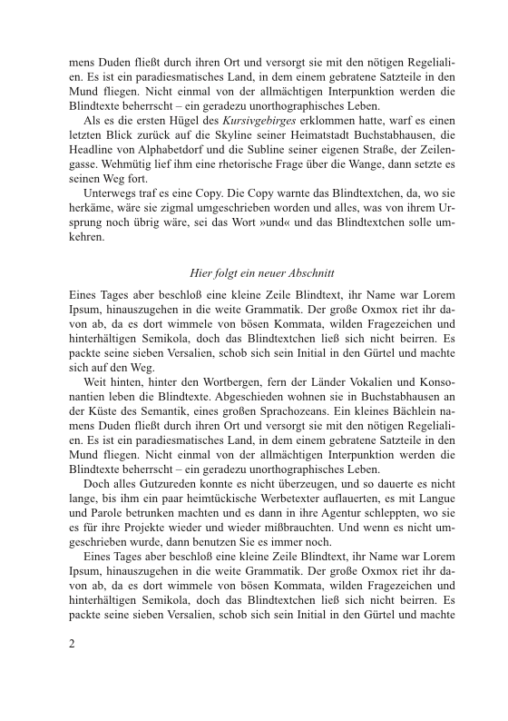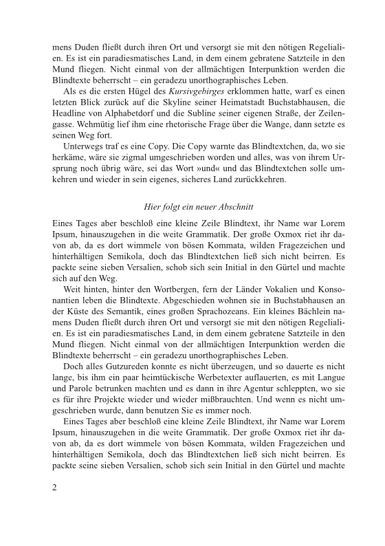 Hier ist eine fiktive Buchseite, die neben glattem Text eine Abschnittsüberschrift enthält. Als gute, gängige Gestaltung dieser Abschnittsüberschrift bietet sich an: auf Mitte, kursiv, Schriftgrad wie Grundschrift, Abstand oberhalb: anderthalb Zeilen, Abstand danach: eine halbe Zeile. So passt sich die Überschrift um eine halbe Zeile versetzt in das Grundlinienraster ein, und der Abstand davor und danach bewirken eine harmonische Gliederung: