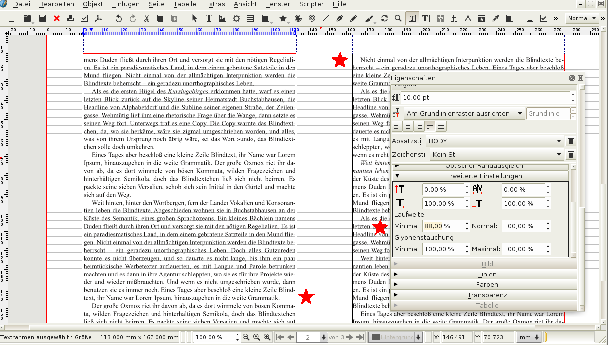 Zusätzlich bietet sich im DTP auch eine Möglichkeit an, die der Bleisetzer nicht hatte: Man kann die Schriftbreite um ein bis zwei Prozent verändern, das fällt nicht auf. Auch dadurch lässt sich häufig eine Zeile ein- oder ausbringen. Um die Schriftbreite für den ganzen Absatz flexibel anzupassen, bietet Scribus die Funktion "Glyphenstauchung". Natürlich kann man auch Kombinationen von "Laufweite" und "Glyphenstauchung" verwenden. Man muss nur darauf achten, dass solche Eingriffe unauffällig sind: Die Schriftbreite sollte nicht so verändert werden, dass man es merkt, die Wortzwischenräume dürfen klein sein, aber nicht so klein, dass kein Abstand mehr erkennbar ist, und nicht so groß, dass Löcher entstehen, über die das Auge stolpert. Manchmal gibt es schwierige Fälle, wo man experimentieren muss.