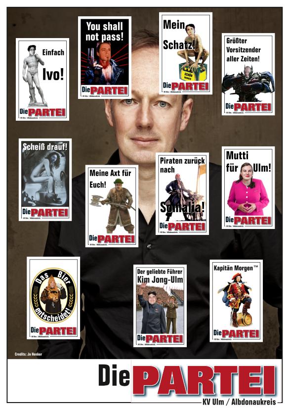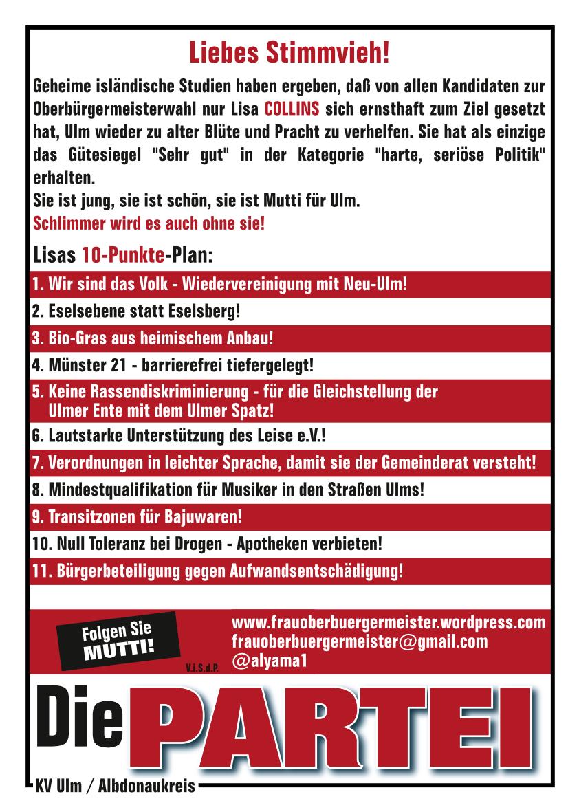 Manutius hat geschrieben: Bei "Liebes Wahlvieh!": Ein klein wenig mehr Rand wäre besser. Gut wäre es, wenn der Rand mit den Senkrechten von D und I in Die PARTEI bündig wäre.
