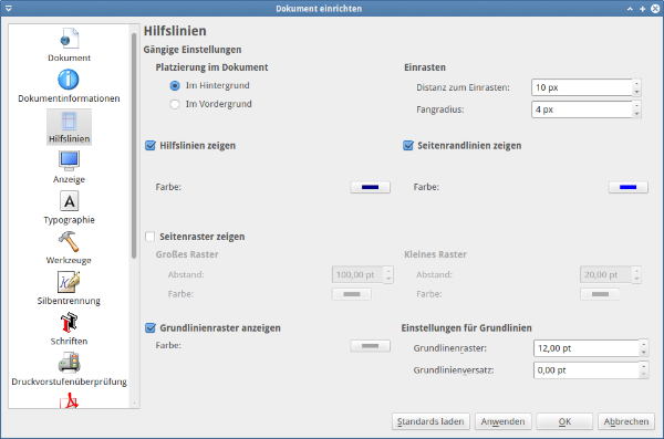 Öffne Menü Datei – Dokument einrichten – Hilfslinien