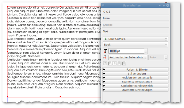Bei meinem Beispiel mit der Schriftart URW Gothic in der Schriftgröße 10 empfand ich eine Zeilenhöhe von 14 pt als angenehm lesbar.