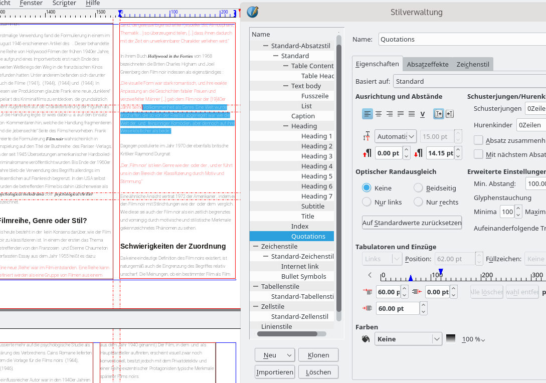 danke...übernehmen habe ich schon angeklickt. Es scheint ein Problem beim übernehmen der Formatvorlagen aus dem odt-Text zu sein. Allerdings ist mir nicht klar, was ich tun kann, damit alle Stile richtig übernommen werden. Es geht um die 'Quotations' im anhgehängten Textdokument (Kopie eines Wikipedia-Artikels). Wenn ich diesen Text in ein Scribus-Textfeld lade, habe ich alle Stile, die Zuweisung des Stiles Quotations funktionier aber aus irgendeinem Grund nicht richtig...