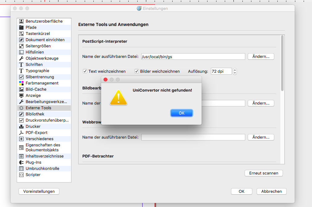 ich arbeite auf einem MAC (High Sierra) und bekomme in Scribus 1.4.6 immer die Meldung, dass er Ghostscript nicht erkennt. Habe Ghostscript installiert, auch mehrfach (vielleicht ist das auch ein Problem?), und es findet keine Verbindung statt.