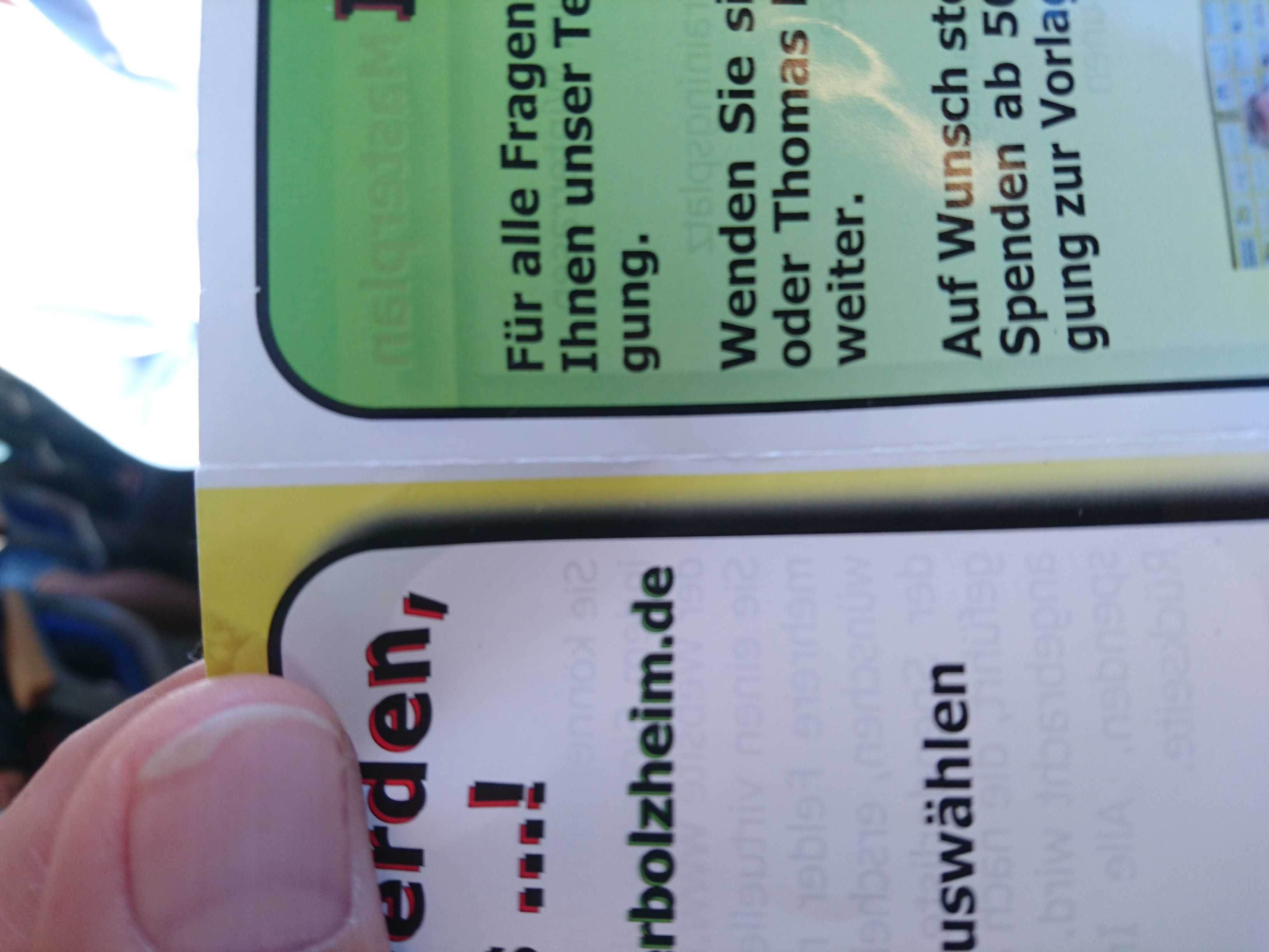 nachdem wir unseren Flyer doch noch fertig bekommen hatten und der Druckerei geschickt haben, sind nun die fertigen Flyer falsch gefalzt. Es ist ein Wickelfalz mit 6 Seiten, die Coverseite ist noch richtig gefalzt, aber der Falz von Rückseitte und Einklappseite ist etwa2 mm auf die Rückseite verschoben, so dass diese nur 98 mm hat und jetzt Elemente der Rückseite auf der eingeklappten Seite zu sehen sind.
