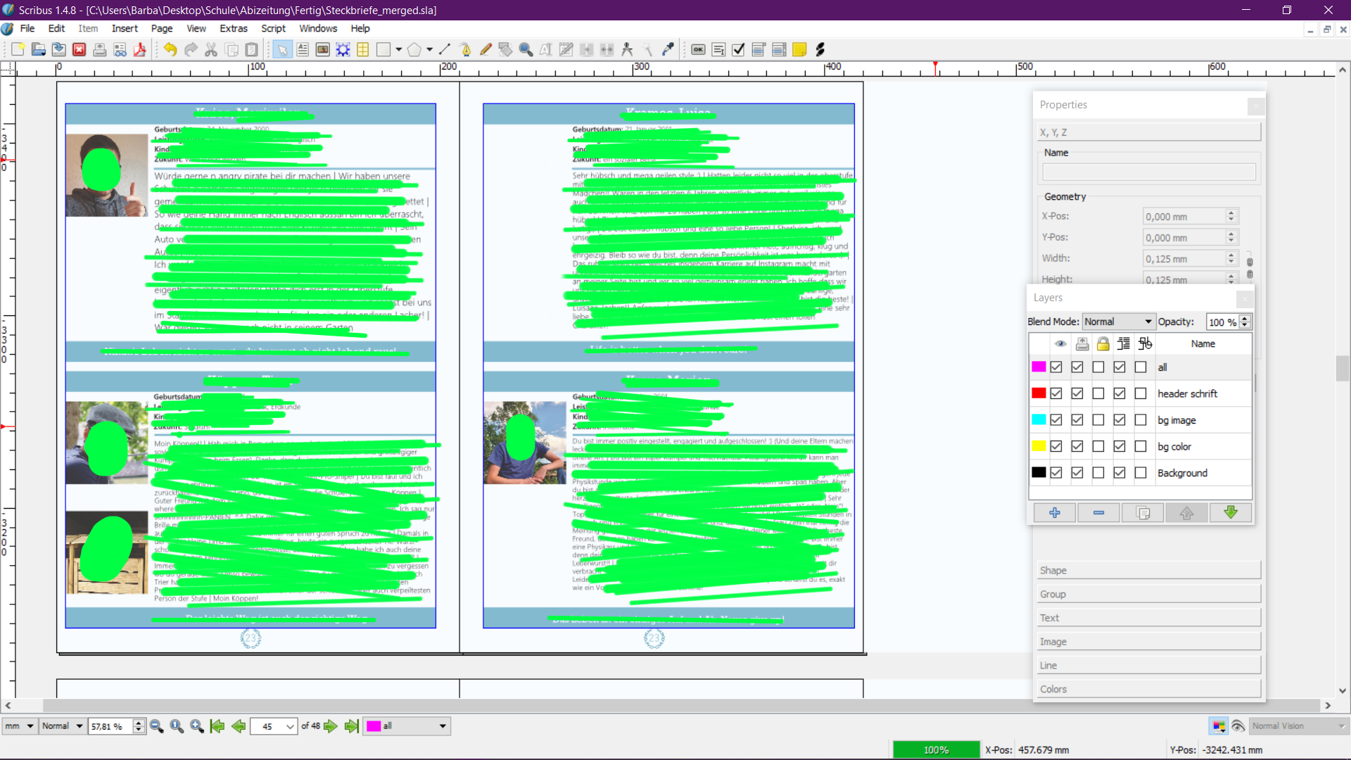 Ich benutze Scribus im Moment um unsere Abizeitung zu erstellen und musste dafür 106 Schüler-Steckbriefe eintragen. Dafür habe ich ein Layout erstellt und dieses als Template an ein paar Helfer geschickt, welche daraufhin ihren Teil ausgefüllt und mir in Form eines neuen Template-Ordners zurückgesendet haben (Damit ich alle Bilder hab).