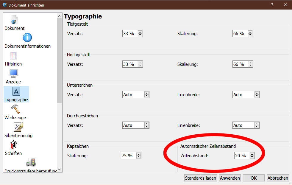 *) <typomonk>Der Wert ist auf hier auf 20 % gesetzt, was nahelegt, dass hier nicht Zeilenabstand sondern Durchschuss gemeint ist. Zeilenabstand wäre 120 %. Aber wer schon automatischen ZAB verwenden möchte, den dürfte das ohnehin nicht groß stören