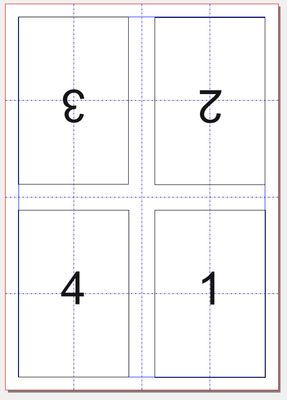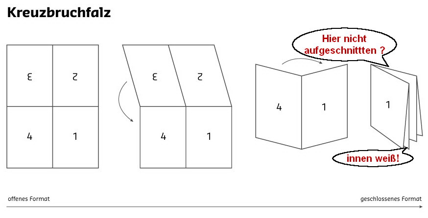 nein, ich möchte mit einem Kreuzbruchfalz aus einem einseitig bedruckten DIN A4 Blatt ein vierseitiges DIN A6 Faltblatt machen. Beim ersten Falten (quer) erhalte ich vorne die Seiten 4 und 1, auf der Rückseite die Seiten 3 und 2. Wenn ich dann noch mal längs falte, habe ich alle Seiten in der richtigen Reihenfolge und korrekt orientiert.