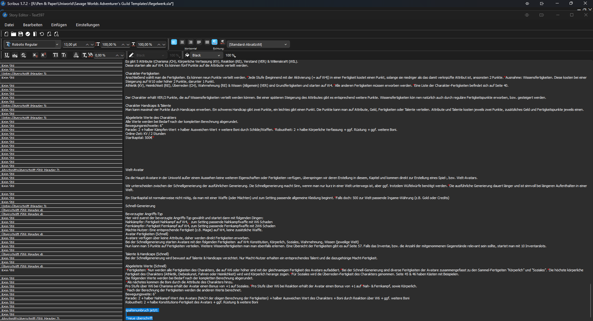 Im Beispielscreenshot habe ich nach dem Text "spaltenumbruch jetzt" einen Spaltenumbruch eingefügt. Und in der neuen Spalte ganz oben dann einen anderen Absatzstil gewählt. Aber wie man im Texteditor sehen kann, sind der Spaltenumbruch und die Überschrift in der gleichen Zeile, bekommen also den gleichen Absatzstil. Dementsprechend habe ich in der vorherigen Zeile beim Umbruch auch bereits den Stil der Überschrift.