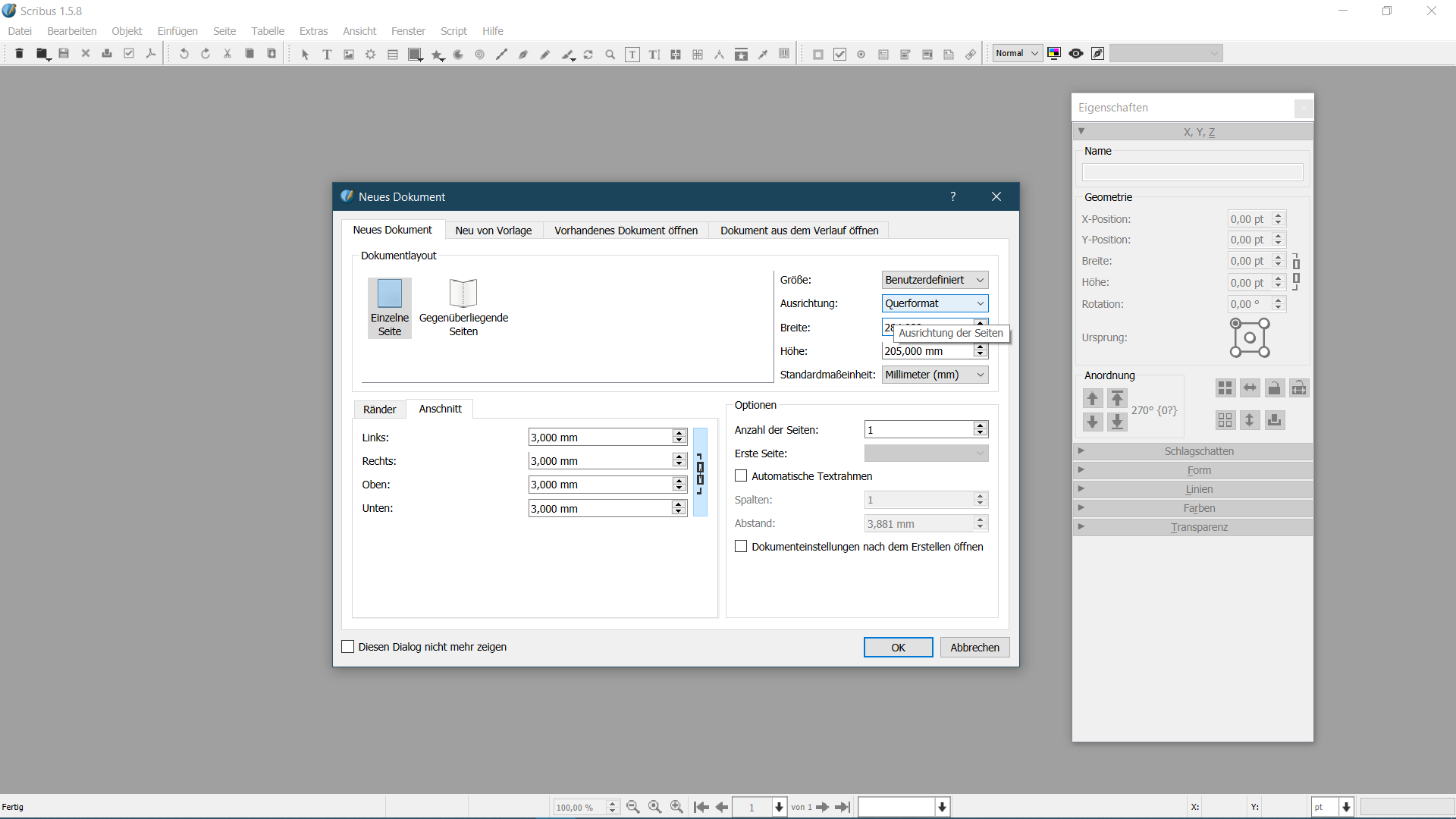 Laut Tolino soll ich ein Neues Dokument in Scribus anlegen mit den Maßen aus der Umschlagberechnung und zwar Gesamtbreite ohne Beschnitt und Gesamthöhe ohne Beschnitt. Zusätzlich im Reiter Anschnitt den gewünschten Anschnitt (bei TB wäre das 3 mm) einstellen.