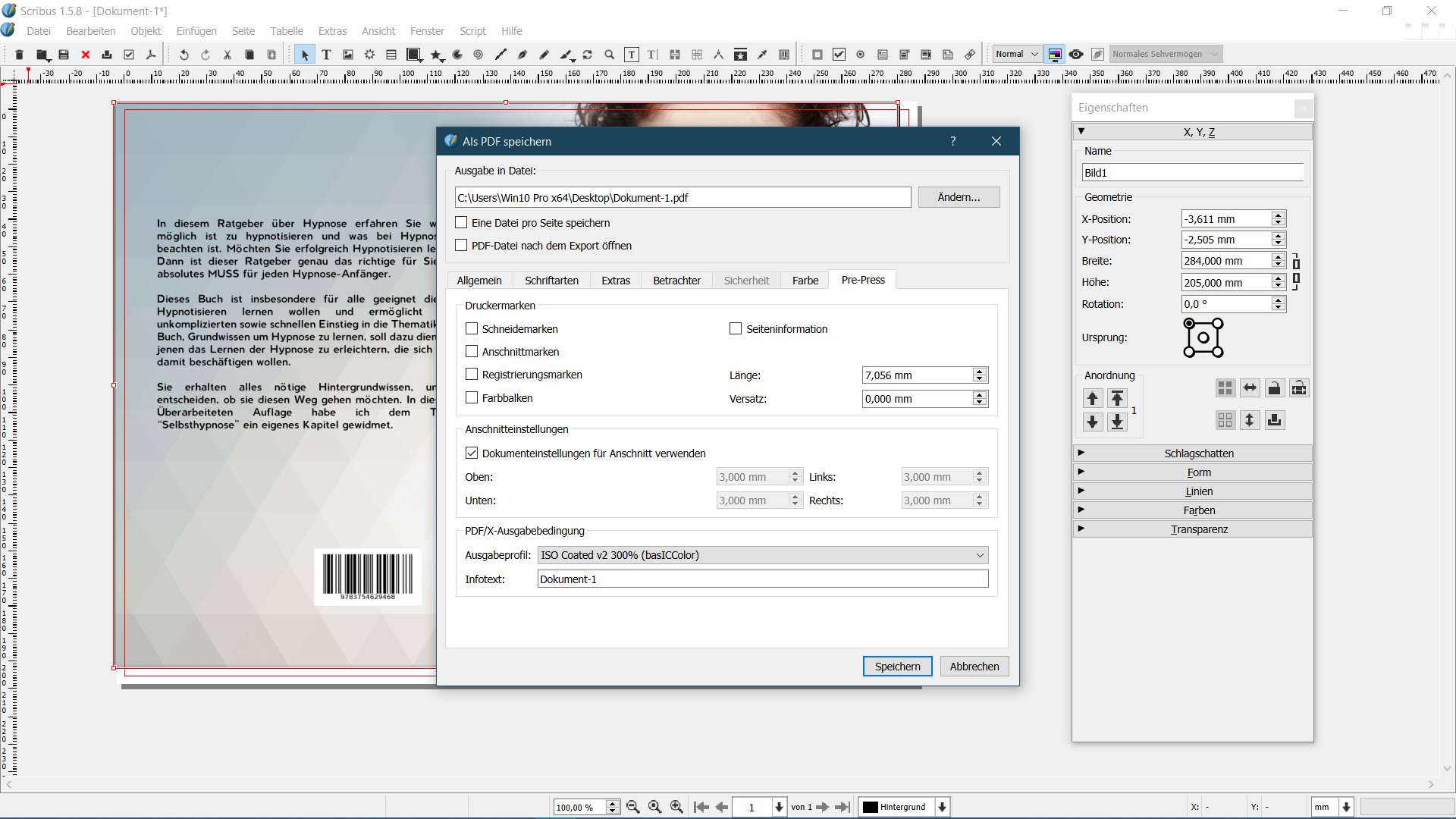 Ich habe ein Bild für mein Buchcover im jpg Format, nun möchte ich bei Tolino Media veröffentlichen und muss das Cover in ein PDF umwandeln, Tolino verlangt 3mm Beschnitt (290x211 mm mit Beschnitt und 284x205 mm ohne Beschnitt).