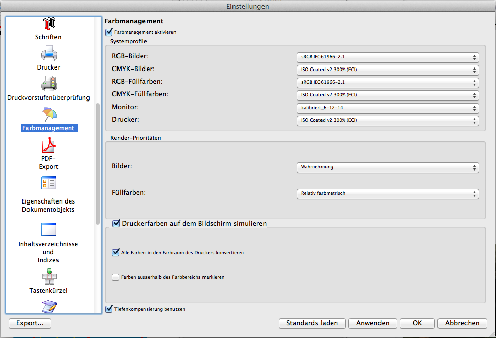 falls extern gedruckt wird, sollte das profil von der druckerei erfragt werden. - unter ‚render-prioritäten‘ wird die art der farbkonvertierung bestimmt. die im screenshot eingestellten prioritäten sind im allgemeinen sinnvoll (die konvertierung der bilder ist auf die menschliche wahrnehmung abgestimmt, der ausgangsfarbraum von grafiken wird gleichmässig auf den zielfarbraum skaliert.)