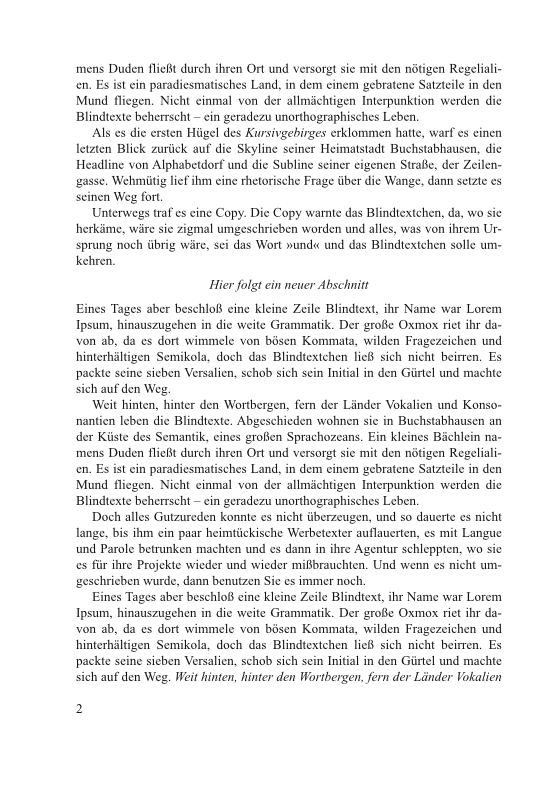 Hier ist eine fiktive Buchseite, die neben glattem Text eine Abschnittsüberschrift enthält. Als gute, gängige Gestaltung dieser Abschnittsüberschrift bietet sich an: auf Mitte, kursiv, Schriftgrad wie Grundschrift, Abstand oberhalb: anderthalb Zeilen, Abstand danach: eine halbe Zeile. So passt sich die Überschrift um eine halbe Zeile versetzt in das Grundlinienraster ein, und der Abstand davor und danach bewirken eine harmonische Gliederung: