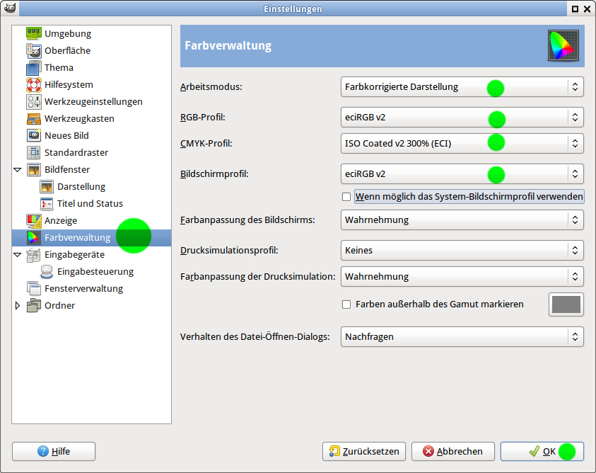 Einstellung der Farbprofile in GIMP