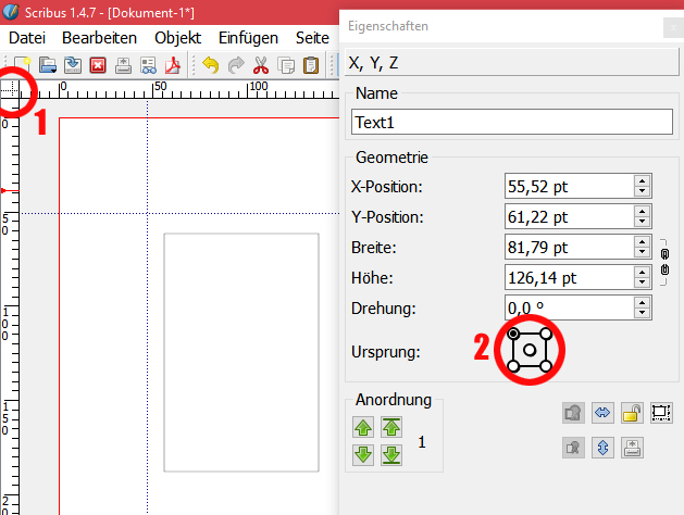 (1) In der oberen linken Ecke kannst du den Nullpunkt der Seite festlegen, indem du mit gedrückter Maustaste vom Feld aus auf die Seite ziehst (dann erscheint zusätzlich ein Feld mit X/Y-Koordinaten, das es aber nicht durch den Screenshot geschafft hat).