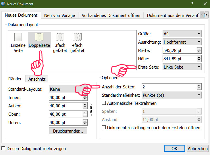 So erhältst du zwei DIN-A-4-Seiten, die genau nebeneinander liegen. Auf diese kannst du die Inhalte der vorhandenen SLA-Datei einfach per Copy und Paste einfügen und die Seiten als zweiseitiges PDF exportieren.