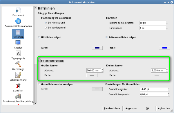 Aktiviere die Option „Seitenraster zeigen“. Stelle das große Raster auf 50 mm und das kleine Raster auf 5 mm ein.